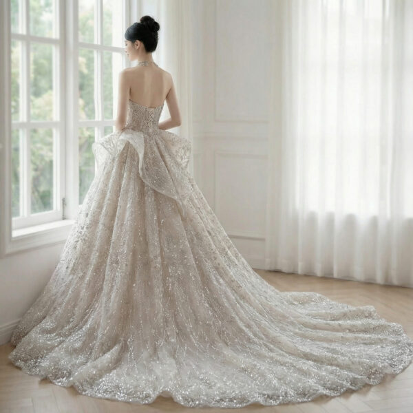 繊細なビジューとグリッターが光をまとい、キラキラと眩い煌めきでゲストを魅了する1着。