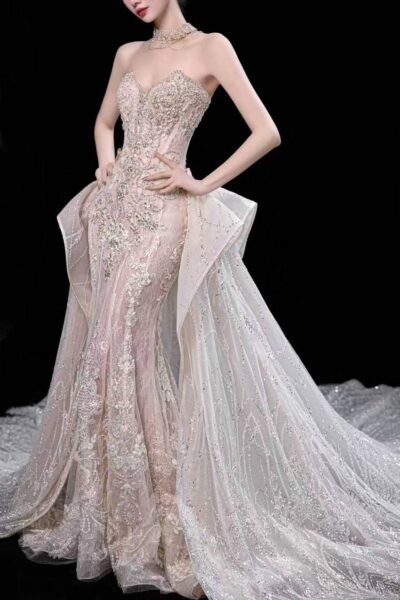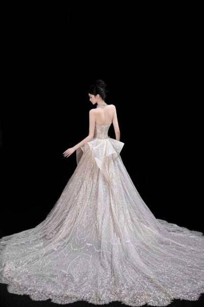 チャペルフォトやナイトウェディングにも映える煌めきドレスです。